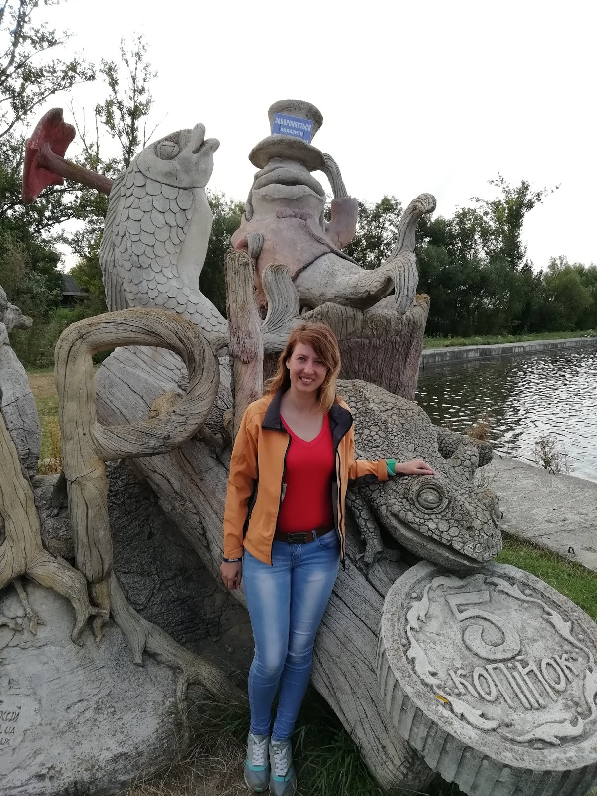 При в'їзді у село нас зустріли ставки з надзвичайними краєвидами і скульптура яка захоплює уяву, ще таких вїздних знаків я не зустрічала. Всіх приїзжих зі сторони Гусятина вітає цікава команія : лебеді, риба, галантний сом в капелюсі та метрова жабка зі своїми п'ятьма копійками, яку так і хочеться погладити.