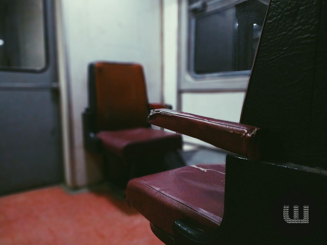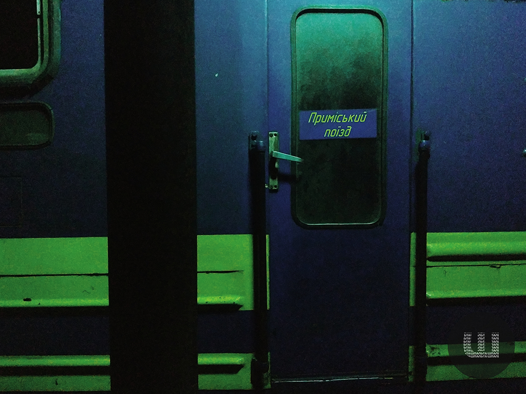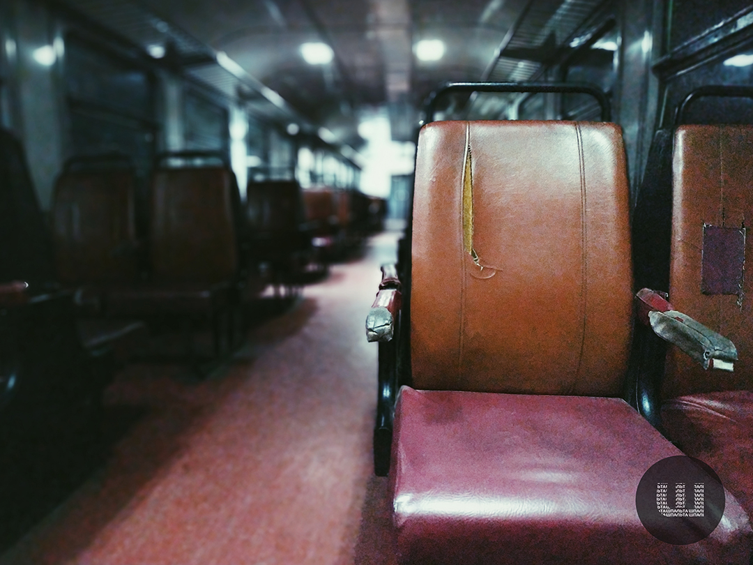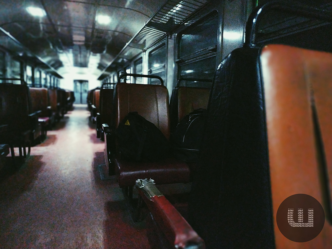 Із вікон у салон падає м’який смарагдовий відблиск ліхтарів на пероні, що освітлює витерті, місцями подерті, а місцями зашиті чи залатані сидіння. З протилежного кінця вагона лунає перешіптування двох людських тіней. Сідаю на найближче місце та чекаю відправлення.