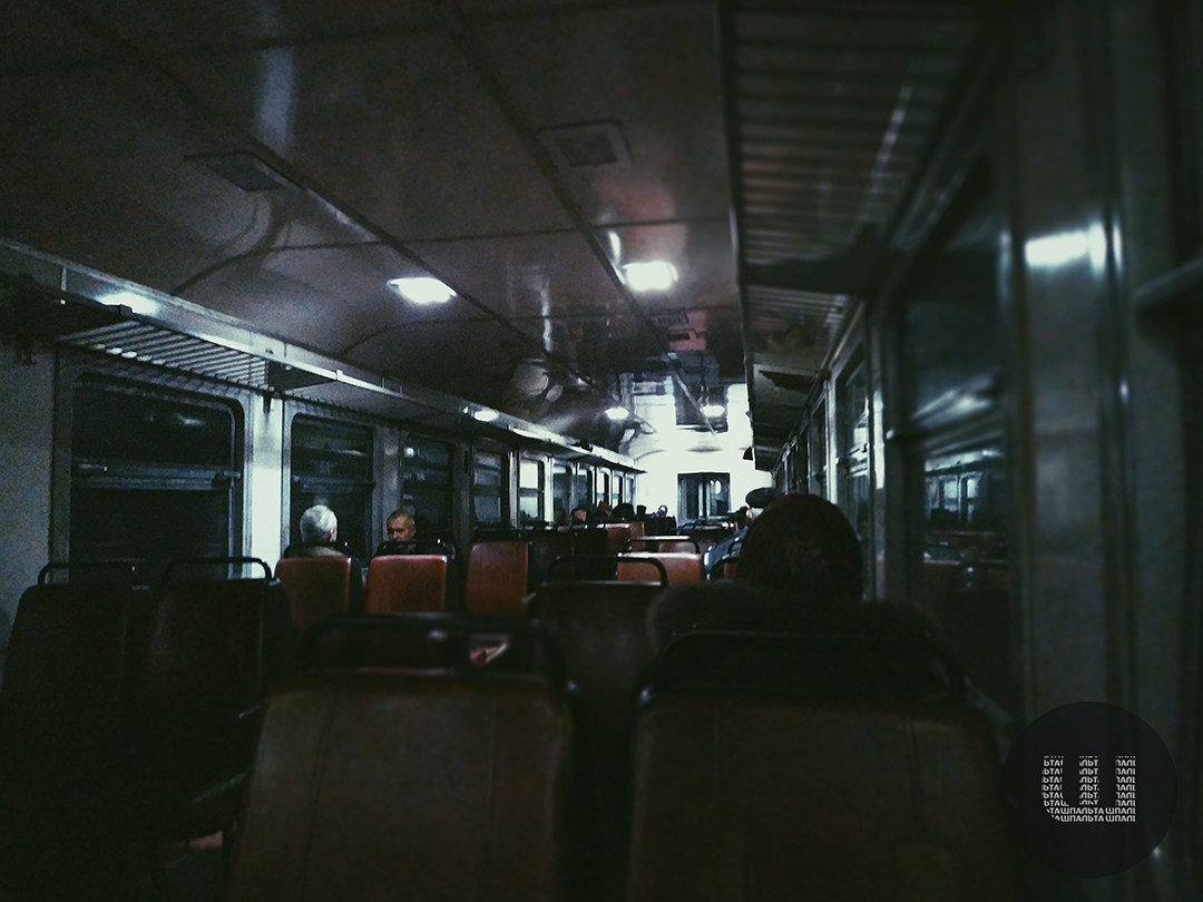 Поки електричка не рушила, вирішую роздивитися все та пофотографувати. Раптом у вагоні вмикають світло, і я бачу чоловіка та жінку, що сидять з іншого боку вагона та кидають недовірливі погляди на мене й камеру. За декілька хвилин повз мене проходить чоловік років п’ятдесяти, який підозріло зиркає на та виходить із вагона. Повернувшись, запитує, навіщо фотографую.